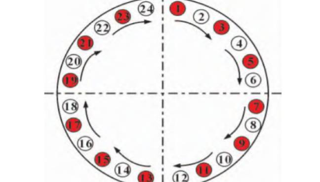 如上圖24路螺栓法蘭50%螺栓拉伸器覆蓋編號圖我們可以看出,螺栓依然是依次編號,只不過在安裝螺栓拉伸器時是總數(shù)分為兩組,隔一顆安裝,總體覆蓋便可以達到50%也就是12顆。安裝好之后按步驟拉伸即可。如此可知,24路螺栓法蘭25%的螺栓覆蓋需要做到6同步編號,也就是6組4個號,先均分為6個點標(biāo)“1”,再取間隔之中為“2”,依次取中編“3”,編“4”,編完即可。拉伸時按照編號分次拉伸。