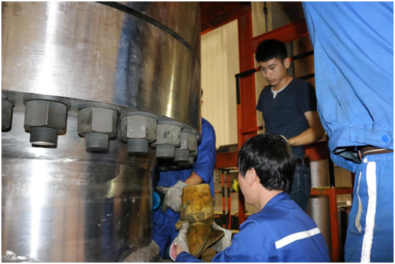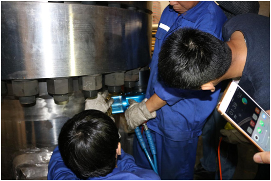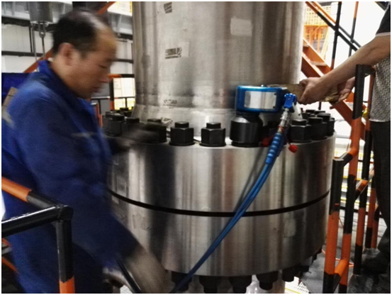 現(xiàn)場工作人員非常認真地與波霆機械工程師進行交流、探討以及學習液壓扳手的正確操作方法。培訓剛剛結束大家就開始忙碌起來,對應兩個法蘭現(xiàn)場工人分成兩組,每組三個人,采用兩同步拆卸螺栓。