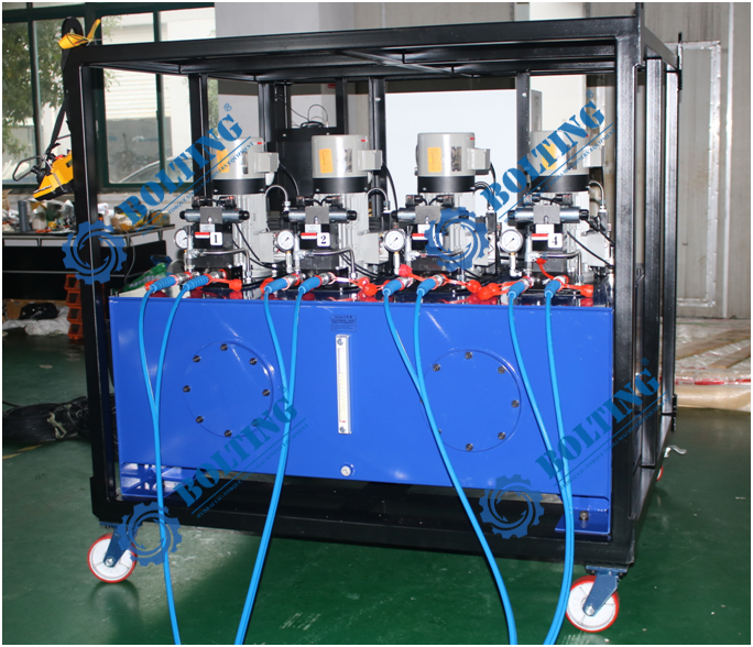 BOLTING博霆1600噸PLC控制全自動同步頂升系統(tǒng)(數(shù)控智能油缸同步控制系統(tǒng))實驗中